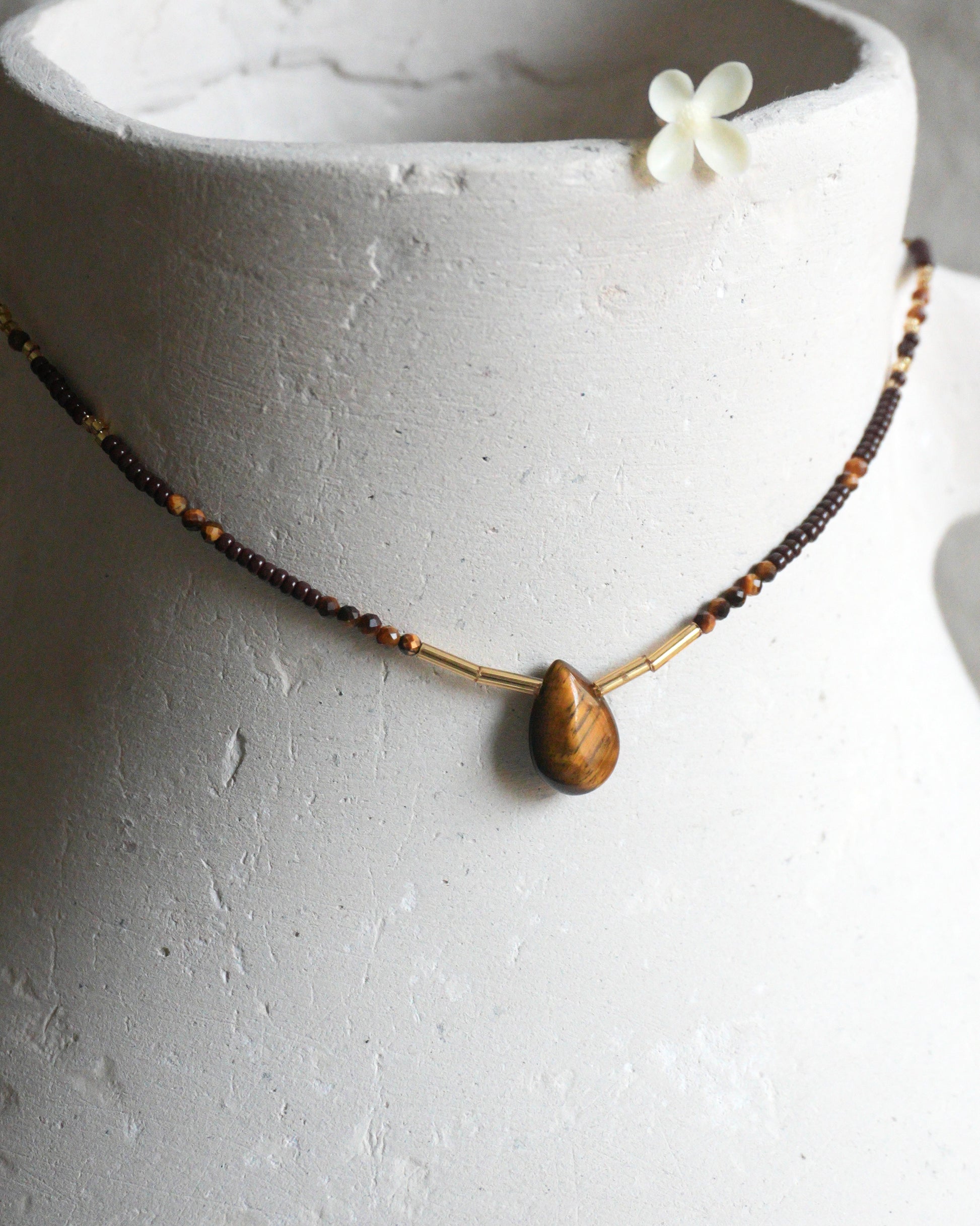 This handcrafted necklace features genuine Tiger’s Eye teardrop & beaded stones, paired with high-quality Japanese Miyuki seed beads in rich brown and gold-lined tones. Measuring approximately 16-inches with 2-inches of 14k gold-plated stainless steel extender chain for a customized fit.